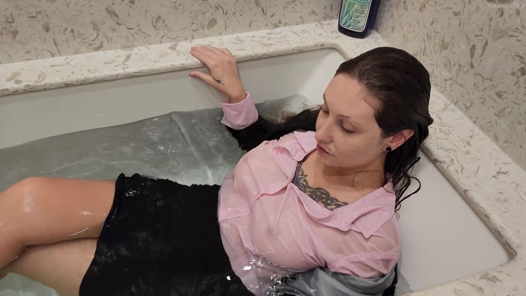 Smiley is home from work and is exhausted. It's a hot summer, and her commute to and from work leave her boiling and wet from sweat. She has to wear a blazer, pantyhose and heels to work to look presentable. She comes home a sweaty and tired. Smiley fills her bathtub and decides not to take off a stitch of clothing. She is going to cool off her body and her work clothes. She used her heels to trickle water on herself. First on her feet... then her legs, then higher and higher. She pours water on her naughty bits and absolutely loves it. She steps in, and her pantyhose clings around her legs and feet. She sit and lays back into the relaxing water and just enjoys herself. She can't help but giggle and smile with excitement. She goes under almost immediately. She loves the feeling of the cool water swishing in and out of her clothes. She grabs and rubs herself all over and really enjoys the bath. She takes off her blazer and unbuttons her shirt and plays with her wet tits. Eventually, after going under over and over again and splashing around. She buttons up her shirt, outs her blazer back on and leaves the tub soaking wet- but thoroughly relaxed and satisfied.