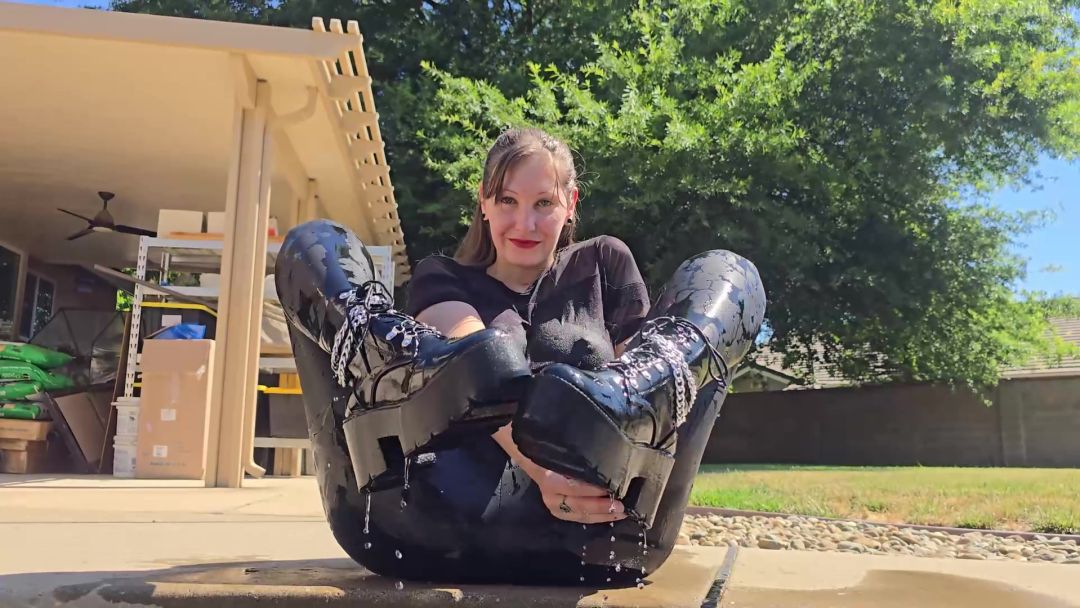 Smiley is wearing leather pants, a black shirt and gothic boots. She slowly dips her boots into the water and squishes around when she walks. The camera goes under the water throughout the video and captures her above and underwater. Bubbles rush out of her boots when they go under. She is wearing Halloween socks under them and shows you them from time to time. They cling tightly to her toes and feet. She uses her boots to pour water on her body and naughty parts. She gets in a swim around before diving in. The water makes her leather pants incredibly shiny and leaves cool designs and patterns on them. Eventually she takes off her shoes and pants and swim for a little while only in her red VS panties and black shirt.