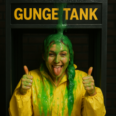 Cruella drives up to an abandoned place in her Tesla. Her henchmen told her to meet them there along with the last Dalmatian. She steps out of the car, It's a mess out here. She is dressed way too nice to be in such a filthy place. She walks up to the door and steps into mysterious goo, but doesn't notice. She pulls and tugs on the knob and is able to shove it open. She excitingly laughs, knowing she is getting closer to getting her hands on the last pup. She tries to lift her foot to step inside and she can't. Her heels are completely stuck. The weird stuff she stepped in seems to be glue. She struggles to break free. Cruella loses her balance and falls flat on her face in the door way. Her heels stayed in place. The bottom of her pantyhose wrapped feet fly through the air. She pulls herself up from the ground and scoffs. She walks up stairs, muttering to herself in disgust. She walks past a hallway and sees a cage with a sign on it that reads "Lucky." He won't be so lucky when she get her hands on him. She pulls back sign and sees an empty cage. But there is a note addressed to her. It says her henchmen are sick of her bossing them around and that they quit. "PS, Have a nice fall!" She scoffs- It's winter?! Suddenly, the floor drops from under her, and she falls through the ground. Her feet plunge into a giant tank full molasses. She falls back into the thick mess and goes completely under. Bubbles rush to the top from her breath. She emerges and wipes the mess out of her eyes but quickly loses balance again and slips under again. She scrambles over to the side and pulls the top half of her body out. Trying to catch a breath. She curses and screams her henchmen names. She tries to climb out but slips back in. Her legs swing and kick in the air while the top half of her body is under the mess. The pulls herself off to the side again. She groans and moans in disgust. Molasses drips off her face and hair. She loses her grip and falls back into the mess. She tries to get out and over and over again but keeps falling back under. Eventually she is able to swing her legs over the side. Stringy, sticky molasses drips off her nylon covered legs and feet. You can see close ups of the mess dripping off her toes. She is able to crawl out of the tank but slips on the mess puddle on the ground and flies back into the tank. She uses the leg method again and is able to finally get out of the tank, but slips again and lands on her back. Making a huge splat noise. She tries to get up and but keeps slipping. She finally gets on her feet and takes a look at the damage done to her outfit. "How can this day get any worse?!" She shouts. Then suddenly, she trips a booby trap that pours a bucket of bright pink cake batter from the ceiling down onto the top of her head. Covering her in pink mess! She is pissed! She rushes off to find her henchmen, they are going to pay!