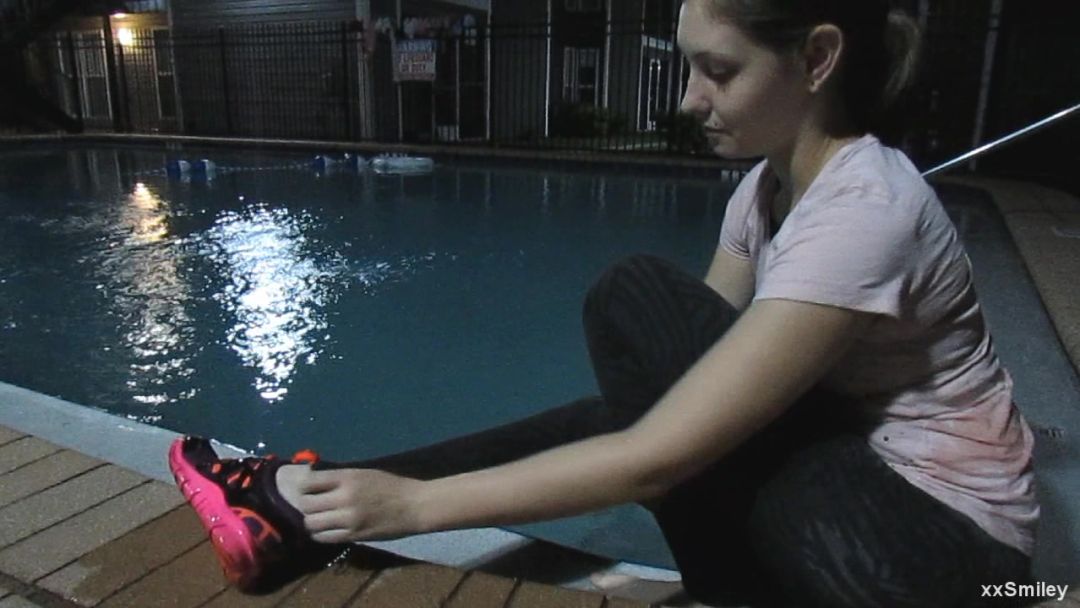 Smiley was riding her bike late at night when she decided to stop by the pool. She quietly sneaks her way in through the gate when no one is looking. Smiley steps into the pool one sneaker at a time until she is completely soaked. She walks in and out of the water to show off her dripping wet clothes. Her Nikes squish and squeaks as she walks around. She also takes off one sneaker at a time to pour water on herself outside the pool. When she is done getting wet, she gets on her bike and wrings out her clothes and hair. Smiley rides her bike home still dripping wet. She talks about how naughty she feels to be out in public soaking wet. You can hear her wet sneakers squeaking every time she pedals her bike all the way home. When she gets home, she slowly takes off her wet clingy clothes and muddy wet sneakers.